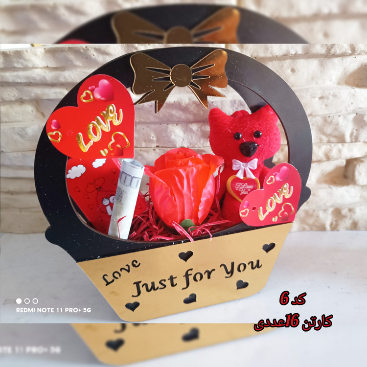 داخل باکس خرس کوچک و یک پاکت شکلات اسمارتیز ،و گل رز قرمز همراه با دلار تزئین شده میباشد